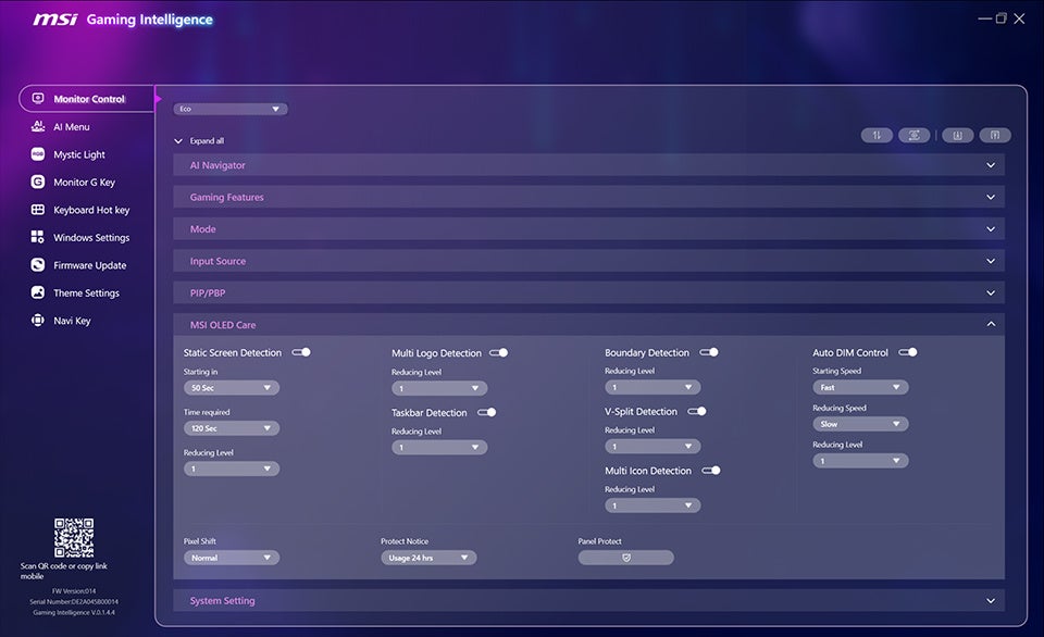 MSI OLED Care機能は、複数の保護レベルによってOLEDパネルの焼き付きリスクを低減する一連のメカニズムを提供し、パネルの寿命と必須の保護メカニズムのバランスを保つことができます。