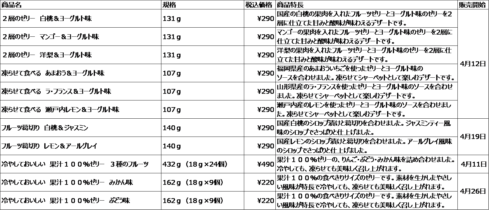 なお、昨年もご好評いただいた、冷やしておいしい 果汁100%ゼリーも4月11日および4月26日から発売します。りんご、ぶどう、みかん味の3種を詰め合わせた「冷やしておいしい 果汁100%ゼリー3種のフルーツ」と、「冷やしておいしい 果汁100%ゼリーみかん味」、「冷やしておいしい 果汁100%ゼリーぶどう味」の3種類を発売します。