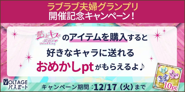 毎日の胸キュンが貯まる!無料会員ポイントサイト「VOLTAGEパスポート」(以下、「ボルパス」)にて「誓キスLR」をお得に楽しめるキャンペーンを開催しております。この機会にぜひ「ボルパス」をご利用ください。