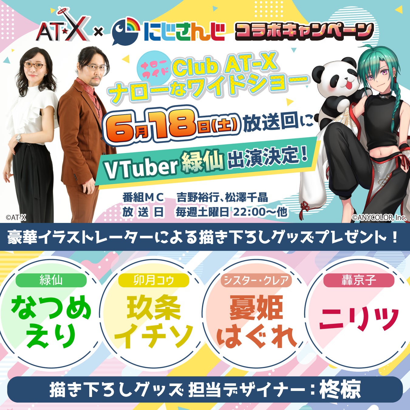キャンペーンを記念して、2022年6月18日(土)放送のAT-Xオリジナル番組『Club AT-X ナローなワイドショー』に、にじさんじ所属の人気VTuber緑仙がゲスト出演いたします。