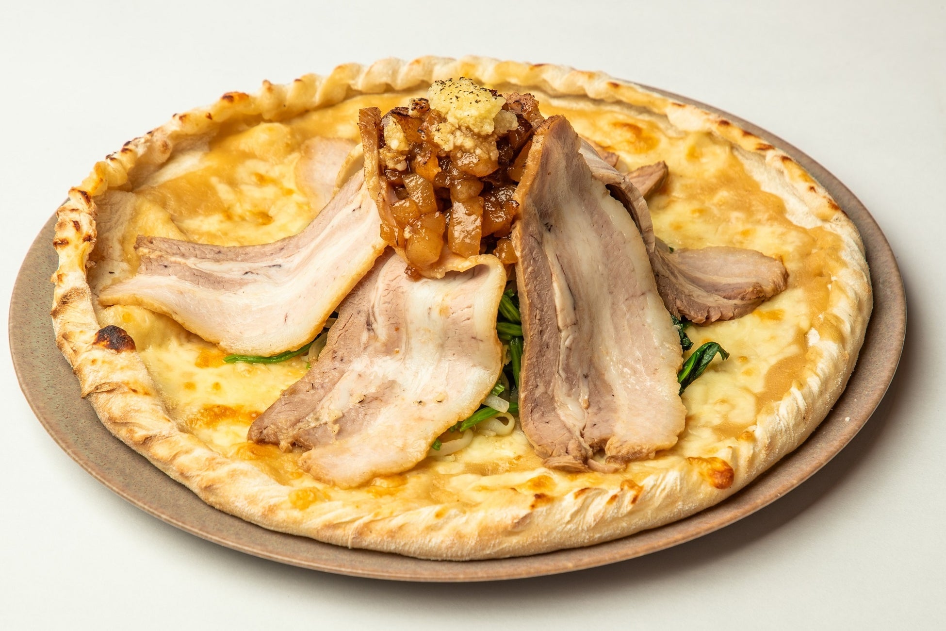 豚骨ベースのソースとチーズの生地に岩手県産「SPF豚岩中豚」のチャーシューやもやし、ほうれん草をトッピング。ラーメンでお馴染みの具材とピザを掛け合わせたベストマッチピザ。背脂のコクがやみつきになり、お酒が進むおつまみにもなるピザです。