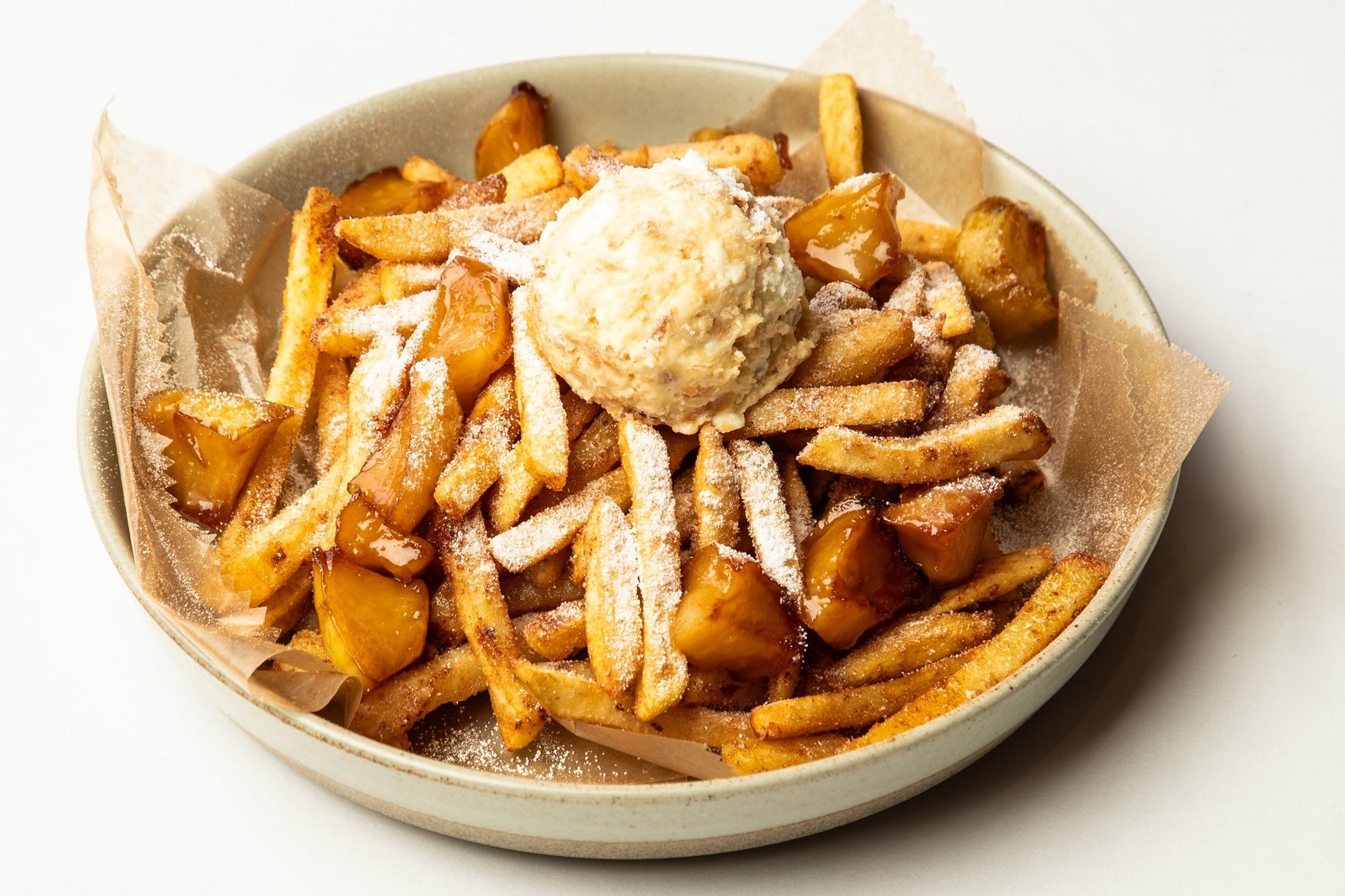 これから旬を迎える青森産のりんごとシェーブルチーズケーキを大胆に合わせた甘じょっぱいフライドポテト。