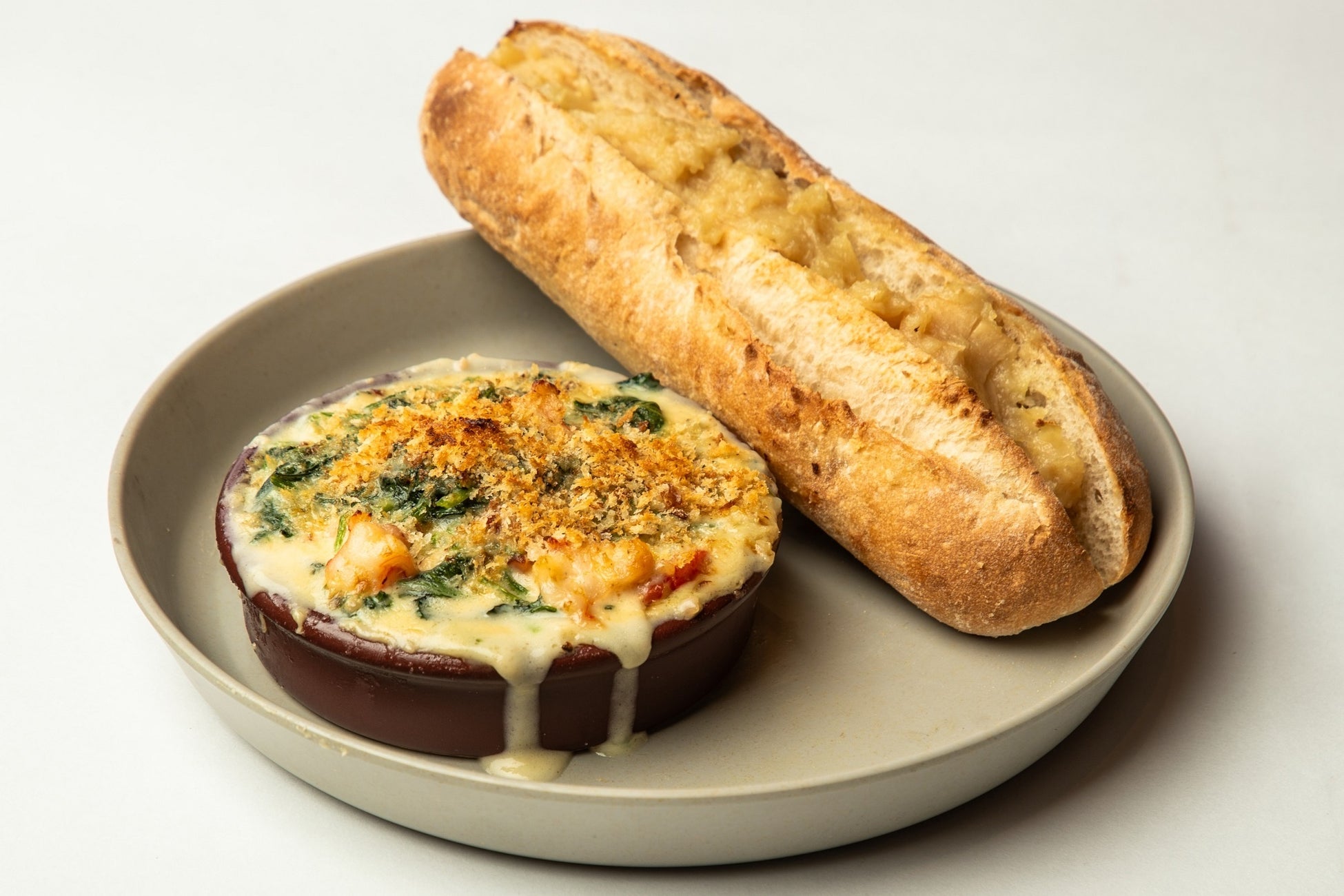 ステーキの付け合せなどでおなじみのクリームスピナッチを主役にした1皿。ガーリックトーストには相性抜群のほうれん草と海老の旨味たっぷりのソースを挟み香ばしく焼き上げました。