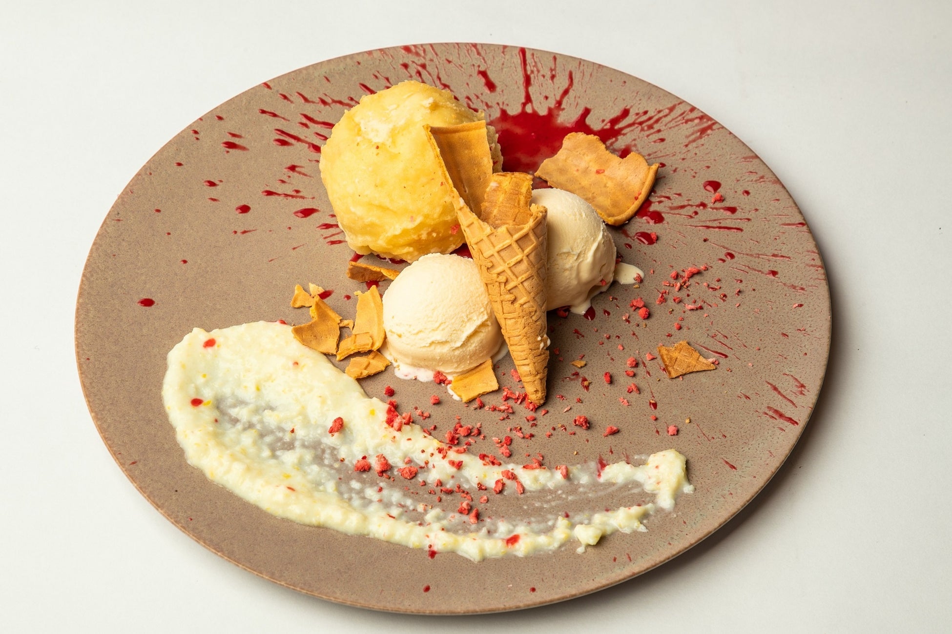 酒粕を使い風味豊かに仕上げたベイクドチーズケーキを天ぷらにしアイスを添えた、HOT&COLDな新しいデザート。レモンソースとフランボワーズソースの酸味と、カリカリのコーンの食感とが合わさったアメリカンな味わい。