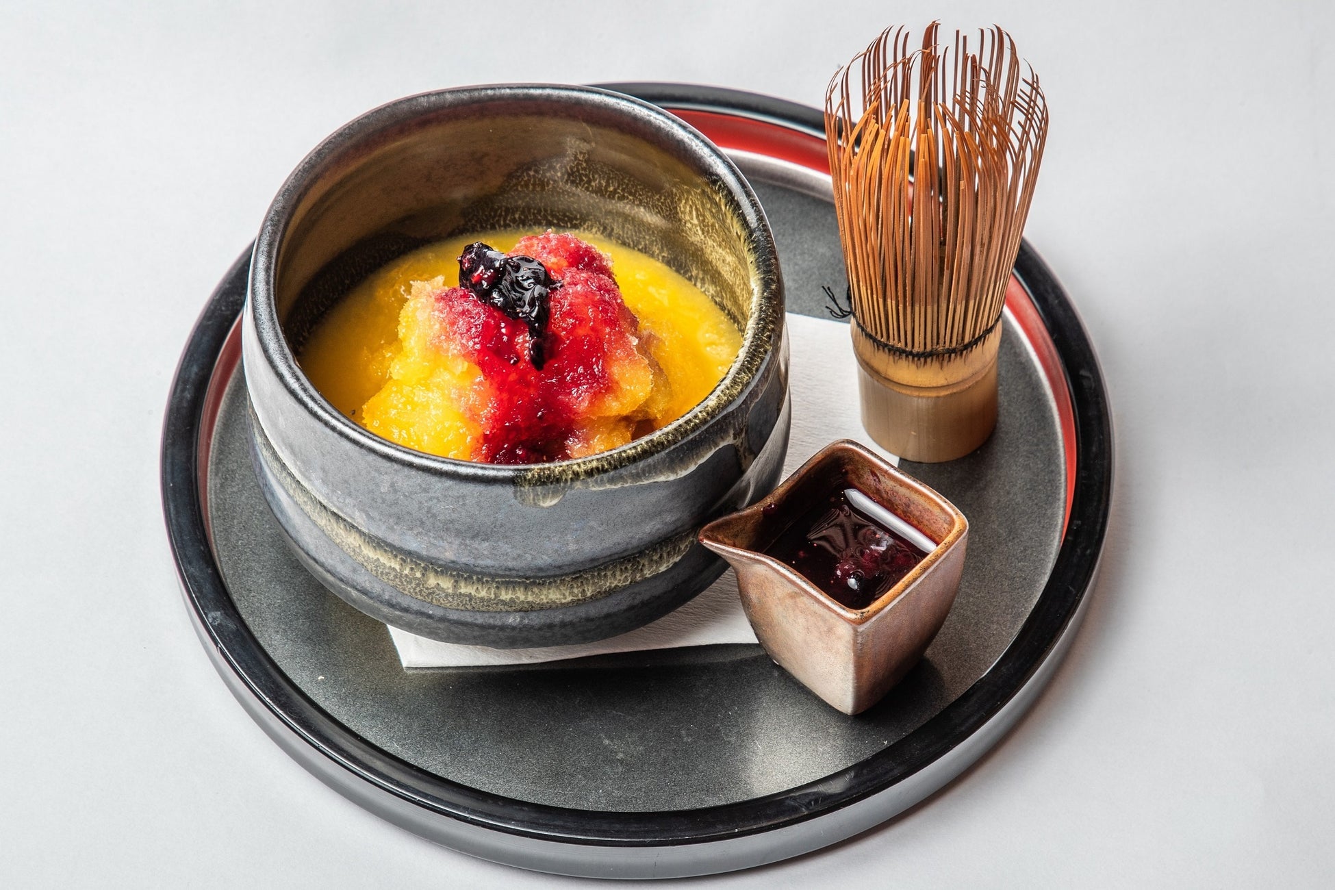 カクテルの王道カシスオレンジを、コタツで食べる冷凍みかんに見立てたカクテル。みかんシャーベットにカシスを注ぎ、抹茶をたてる様に混ぜていただきます。見た目も楽しい和テイストなカクテル。