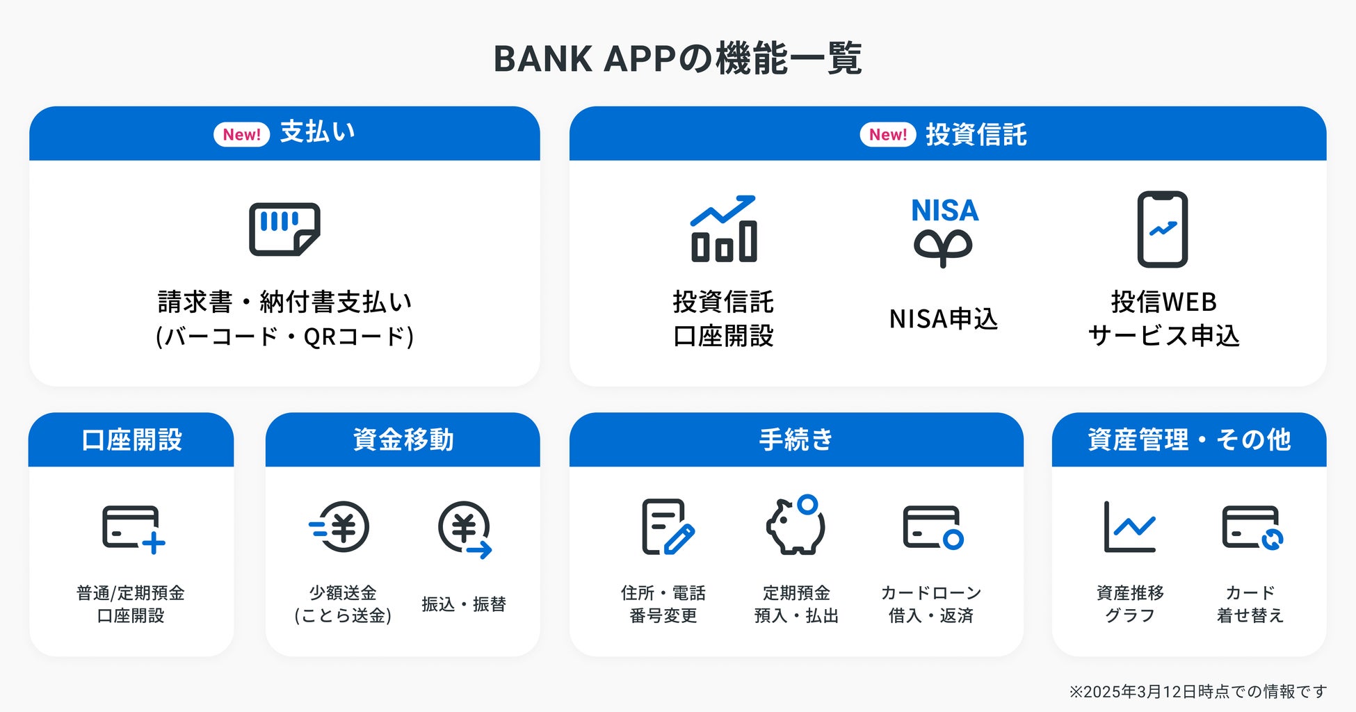 この度、『BANK APP』に、払込票を使った「公共料金や税金などの支払い」と、「投資信託口座開設」の機能を追加します。なお、『BANK APP』は2024年12月に、「振込」と「ことら送金」の機能を追加しており、金融機関の基本的な手続きがアプリ上で完結できるフルバンキングに対応しました。