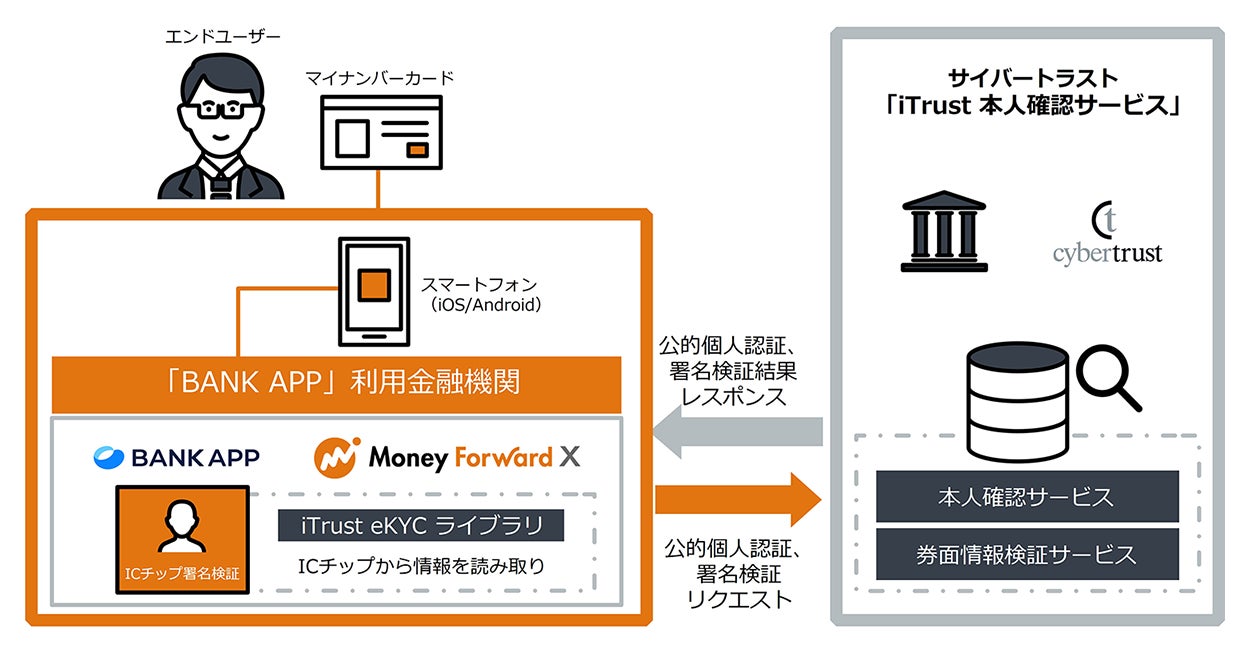 あわせて、口座開設の本人確認に、サイバートラスト株式会社(以下、サイバートラスト)の『iTrust 本人確認サービス』を搭載します。同サービスの搭載により、マイナンバーカードを利用した厳格かつ迅速な本人確認ができ、金融機関とユーザーの安全性・利便性を向上します。本機能は、まず栃木銀行で提供を開始し、他の導入金融機関についても順次対応してまいります。