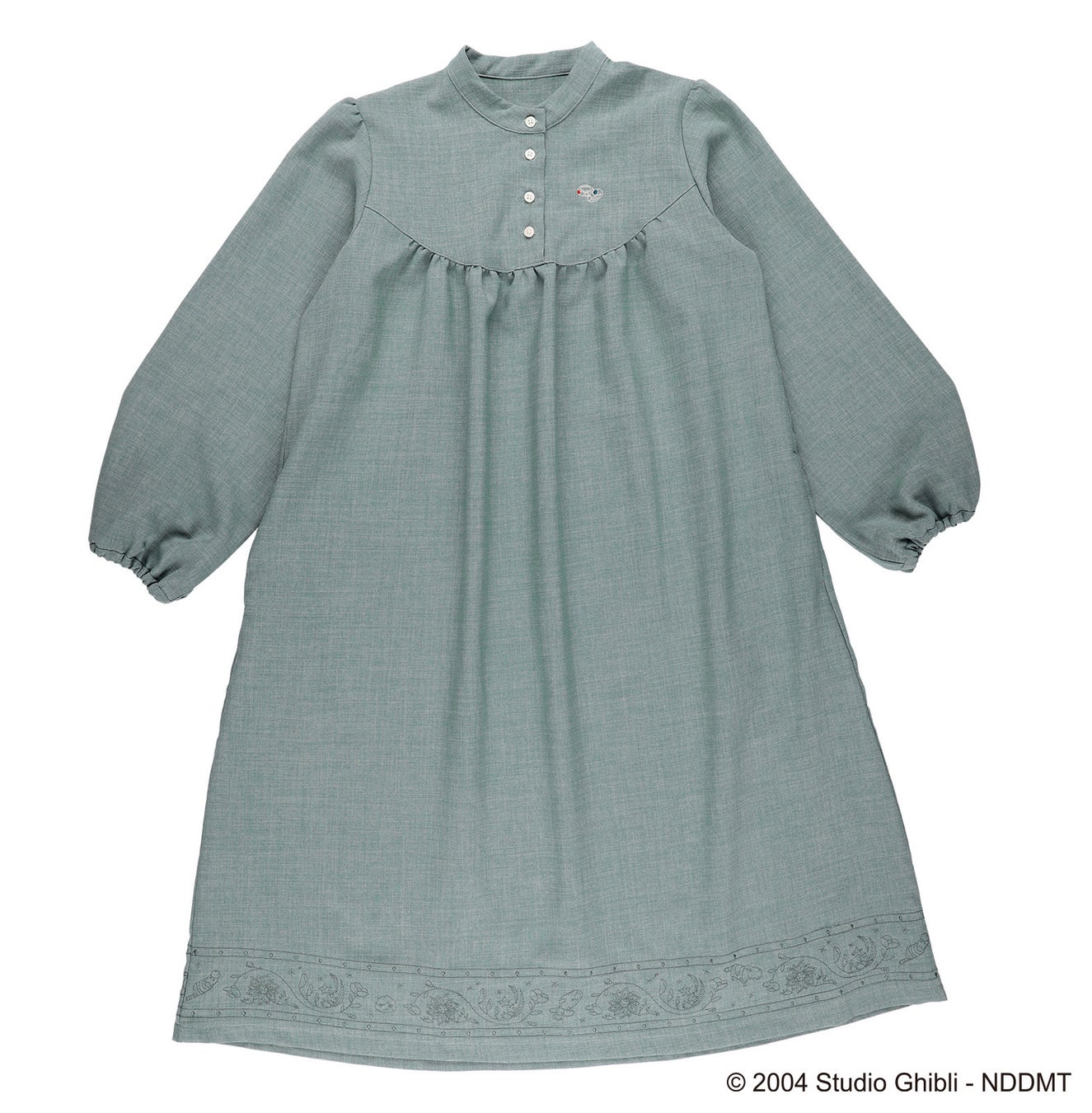 ソフィーをイメージした「空へと舞い上がる 再会のワンピース」は、ソフィーとハウルの出会いのシーンで着用していたワンピースをイメージし、クラシカルな雰囲気で、胸元には指輪の刺しゅうがあしらわれています。ハウルのマント柄をイメージした「魔法使いハウルのマント柄シュシュ」とのセット使いもおすすめです。