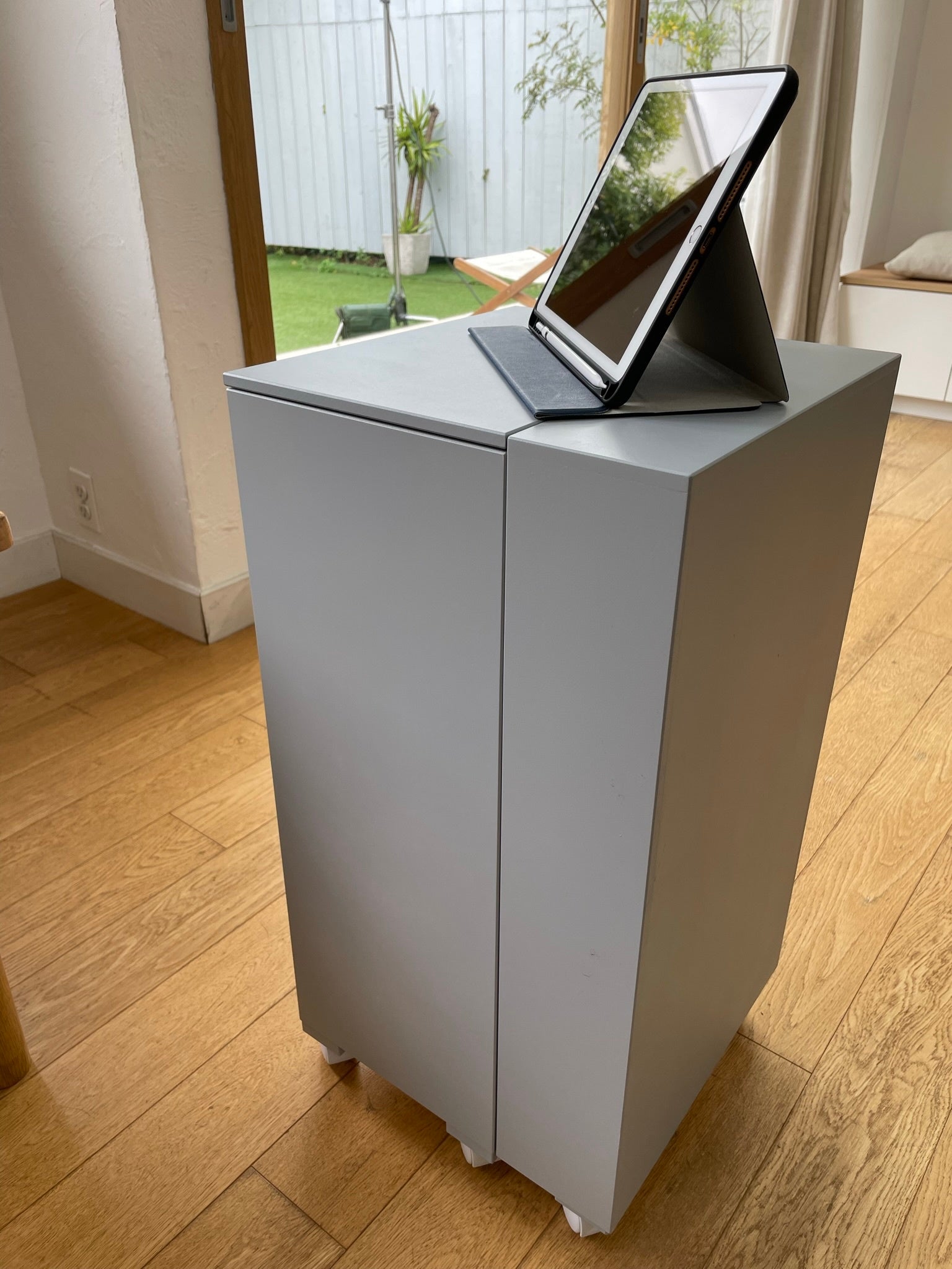 - 扉を閉じて天板にスマートフォンやタブレット端末を置けば、ソファに座りながら楽にライブ配信視聴可能な高さに設計。キャスター付きで移動も楽々。