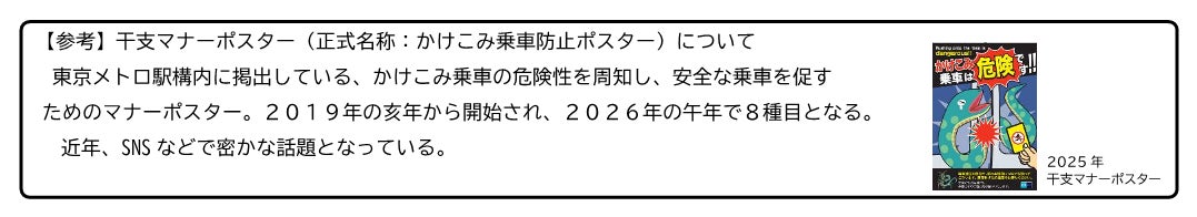 東京地下鉄株式会社(本社:東京都台東区、代表取締役社長:小坂 彰洋、以下「東京メトロ」)は、「干支マナーポスターデジタルスタンプラリー」を2026年1月7日(水)から2026年2月28日(土)まで実施します。