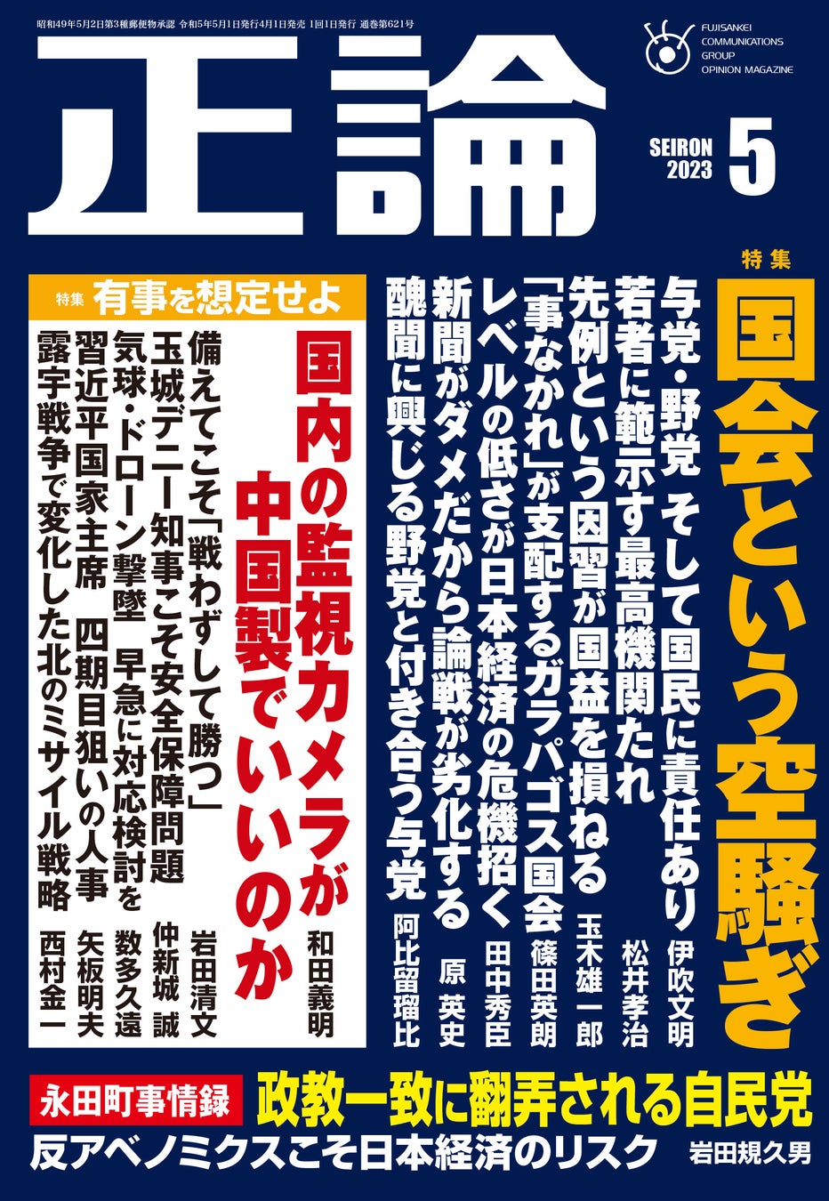 産経新聞社は、日本の針路を考える論壇誌、月刊「正論」の2023年5月号を4月1日に発売します。主な特集は「国会という空騒ぎ」「有事を想定せよ」です。外交をないがしろにして大臣を国会に縛りつけ、スキャンダル追及に明け暮れている国会。伊吹文明元衆院議長、松井孝治元参院議員、玉木雄一郎国民民主党代表らが国会のあり方について苦言を呈しています。作家、杉山隆男氏の海洋軍事小説「Sub」深海の防人たちは最終回となります。