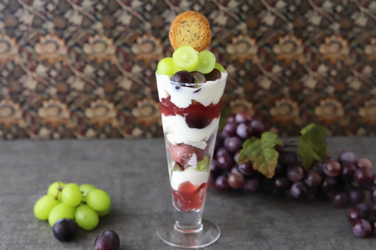 サングリアのジュレをベースに、すっきりとした甘みのクレームダンジュを。クランブルやメレンゲのサクサク感と共に2 種類の葡萄を贅沢に味わっていただけるパルフェです。