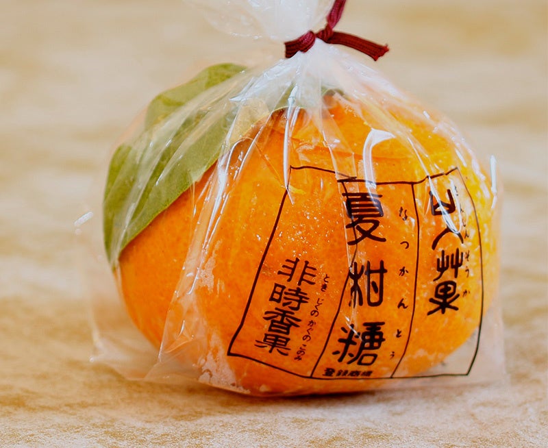 純粋種の夏みかんの中身をくり抜き、果汁と寒天と砂糖を合わせ再び皮に注いで固めました。
