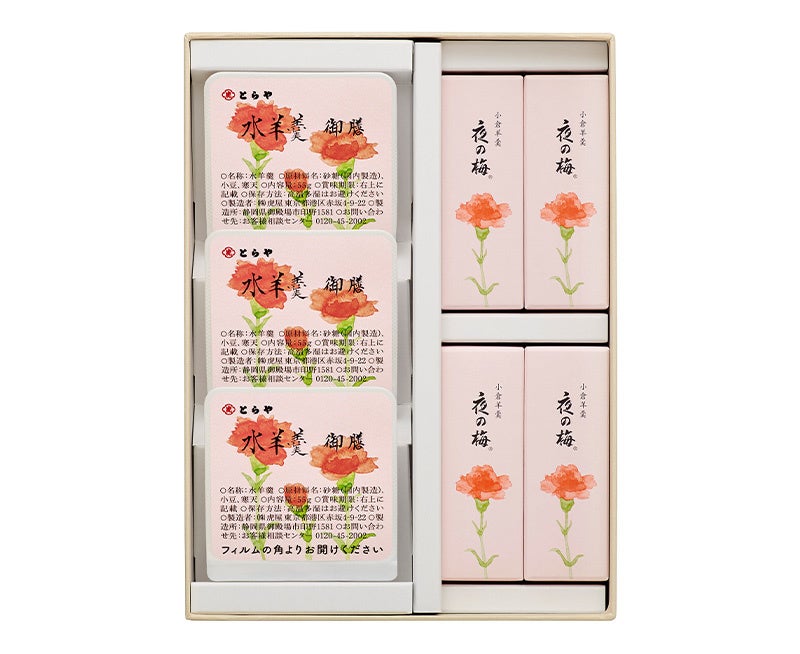 定番の小形羊羹『夜の梅』と、水羊羹 御膳(こし餡)の詰合せです。