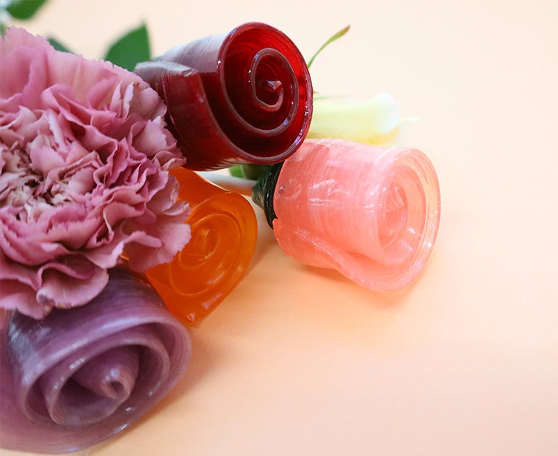 花のように繊細なキャンディ。しかし、食べると濃厚なフルーツの味が広がり幸せが訪れます。