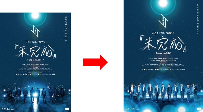 この度、映画公開を機に解禁となった“完成”ポスターは、昨年10月より活動を休止し、11月のライブにも参加が叶わなかった金城碧海も加わり、メンバー11人全員が揃った新ビジュアルとなっています。金城は2月14日に活動を再開し、“未完成”なJO1が“完成”に近づくためには、やはり必要不可欠な存在。先日デビュー2周年を迎え、3年目に突入した彼ら11人への期待がさらに高まるビジュアルとなっています。