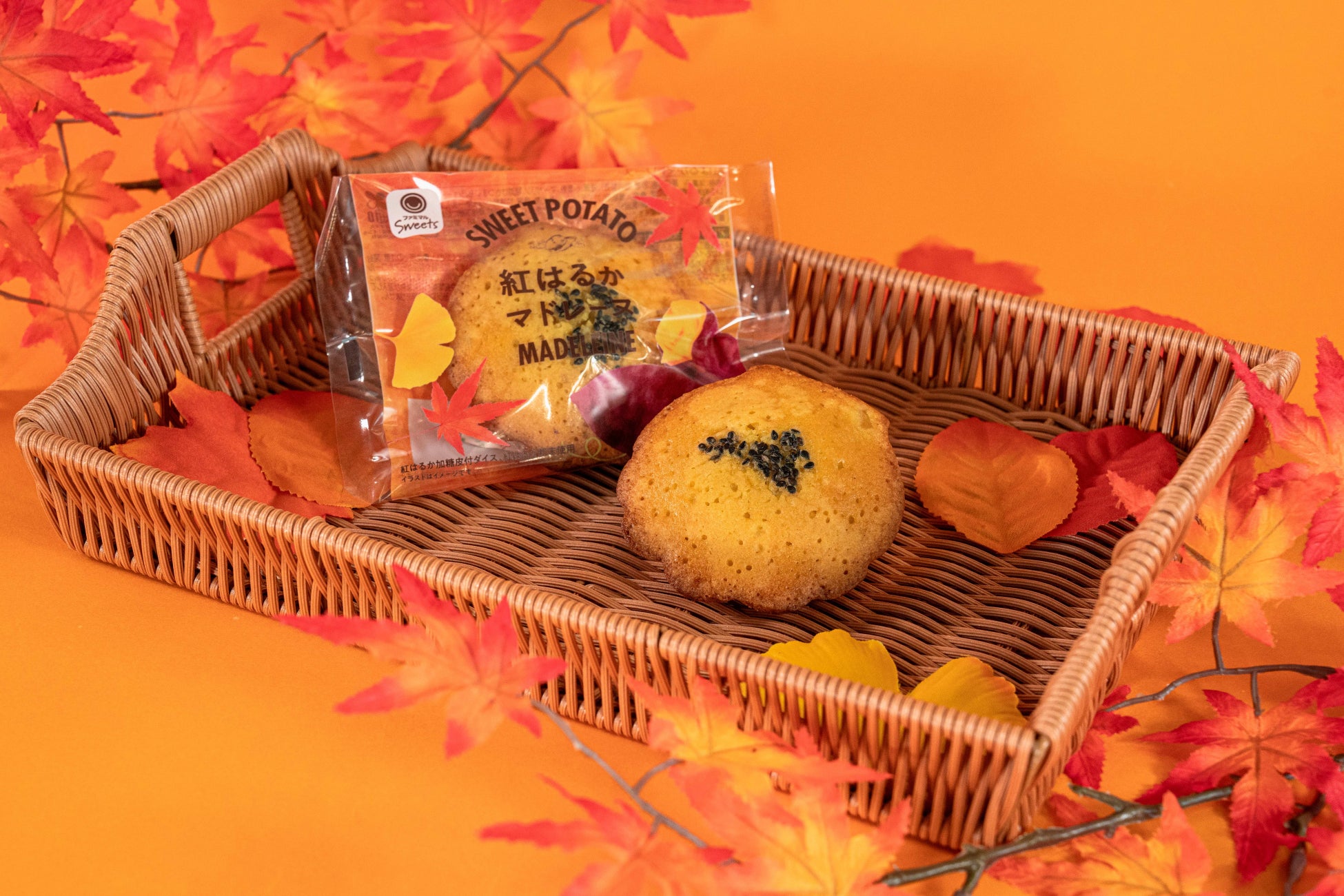 【内容】生地中にダイス状へカットした紅はるかと紅はるかパウダーを使用したマドレーヌです。黒ゴマをトッピングし、見た目にアクセントをつけました。