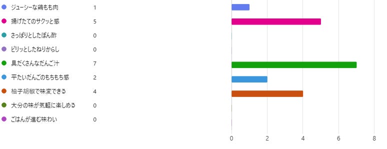 調査の結果、「具だくさんな“だんご汁”」が1位となりました。続いて、2位に「揚げたてのサクッと感」、3位に「柚子胡椒で味の変化を楽しめる」がランクインしています。