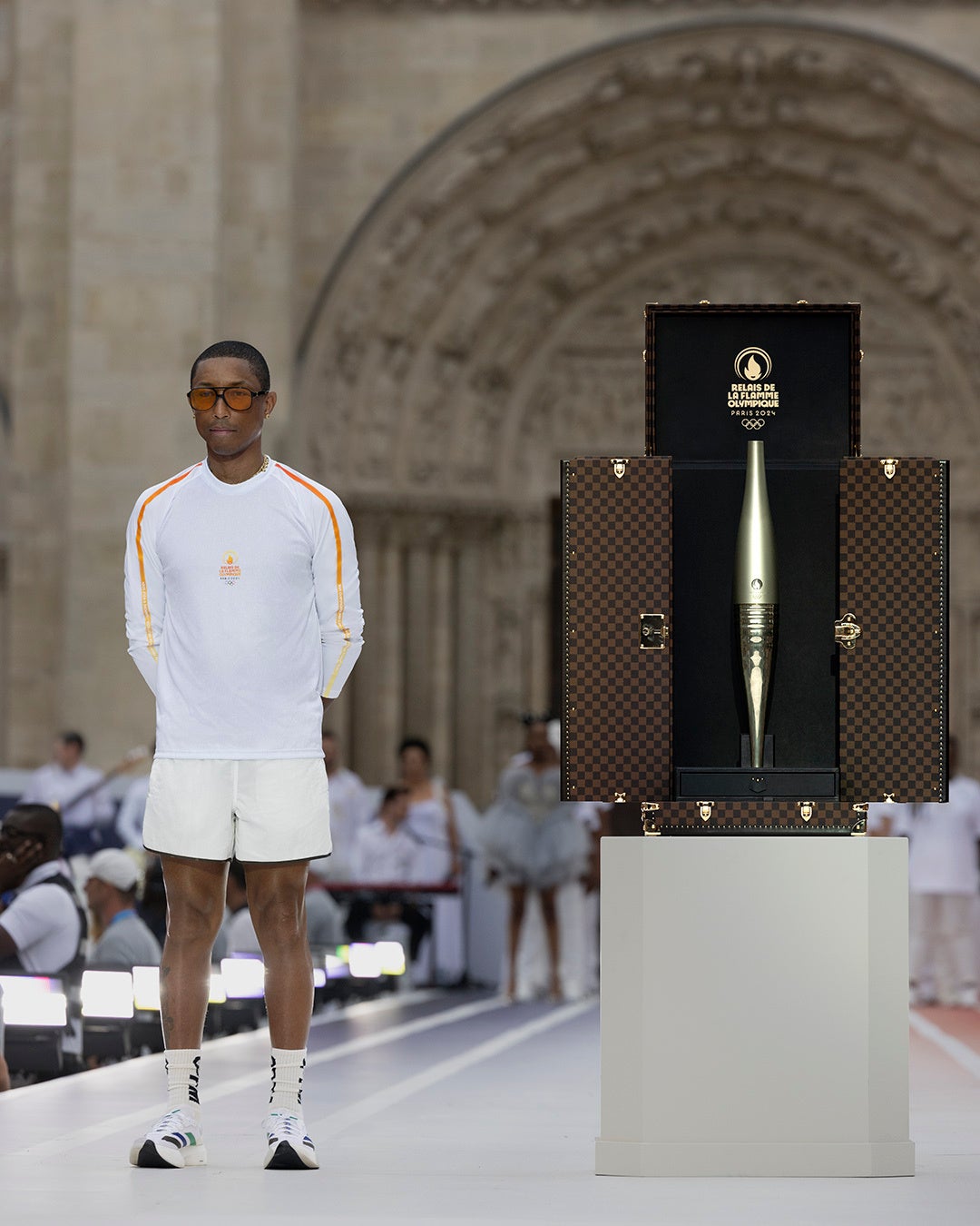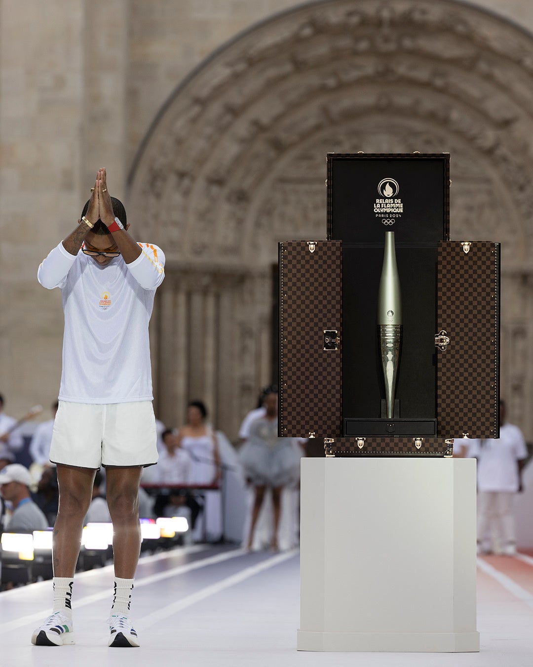 次に3人の聖火ランナーが、ファレル・ウィリアムスが手にしていた今や火の消えたオリンピックのトーチと共にサン・ドニ大聖堂のアーチ型の扉から退場し、トーチの旅は終わりを告げます。彼らは、パリ2024オリンピック・パラリンピック競技大会の公式トーチを保護、輸送、展示するために特別にデザインされたルイ・ヴィトンのトーチ・トランクに向かって揃って進み、最後にファレルがトーチをトランクの中へ。この瞬間は、単に聖火リレーの最終ステージの終了にとどまらず、5月8日に聖火がマルセイユに到着して以来、パリ2024オリンピック競技大会聖火リレーの1万人以上の聖火ランナーが、誇りと責任をもって一丸となって使命を成し遂げた証でもあります。
