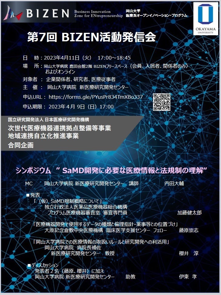 なお、次回は以下のようにBIZEN発信会を行います。地域中核・特色ある研究大学である岡山大学として、医療イノベーション創出強化を戦略的かつ精力的に実施していきます。どうぞご期待ください。