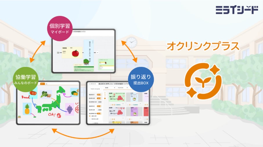 「オクリンクプラス」は、「ミライシード」内に搭載した協働学習用アプリです。個別学習・協働学習・振り返りがひとつのアプリ内で完結できることが特長です。児童・生徒には、シンプルな機能と直感的な操作性をもって個人の思考を深め、共同編集機能によって、考えを協働的にまとめ・表現できる環境を提供し、子ども主体で学び合う授業環境をサポートします。