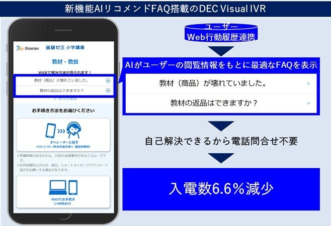 ベネッセコーポレーションお客様相談窓口にて「DEC Visual IVR」を先行導入した結果、AIが表示するFAQをユーザーがクリックし、問題解決ページ(FAQ)を訪問することで、従来のビジュアルIVRより6.6%入電数が減少しました。