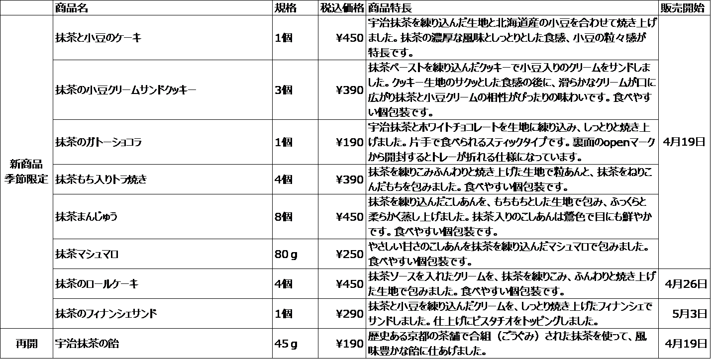 季節限定商品として新たに抹茶の商品を9アイテム販売します。気分に合わせて抹茶を楽しむことができるよう、まんじゅうやトラ焼きなどの和菓子と、抹茶とチョコレートを合わせたガトーショコラや、ロールケーキなどの洋菓子、の両方のラインナップを取り揃えました。生地やクリームなど素材に合わせて抹茶の使用量を調整し、濃厚な抹茶の風味を楽しんでいただける商品に仕立てました。