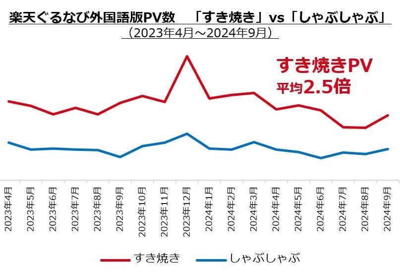 2024年に入り、インバウンド需要は引き続き好調を維持しています。日本政府観光局(JNTO)によると、2024年8月時点で訪日外国人数は7ヶ月連続で同月過去最高を記録しました。外国人観光客に特に人気の鍋料理が「すき焼き」です。「SUKIYAKI」として長年海外でも親しまれており、昨年度の「楽天ぐるなび外国語版(https://gurunavi.com/)」におけるページビュー(PV)数では、同じく和牛を使った「しゃぶしゃぶ」と比較して約2.5倍の人気を誇っています。