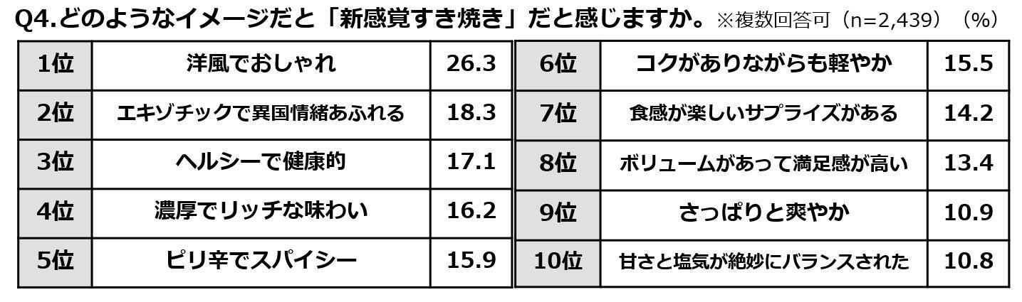 ●「新感覚すき焼き」のイメージは、「洋風でおしゃれ」「エキゾチック」「ヘルシー」が上位。