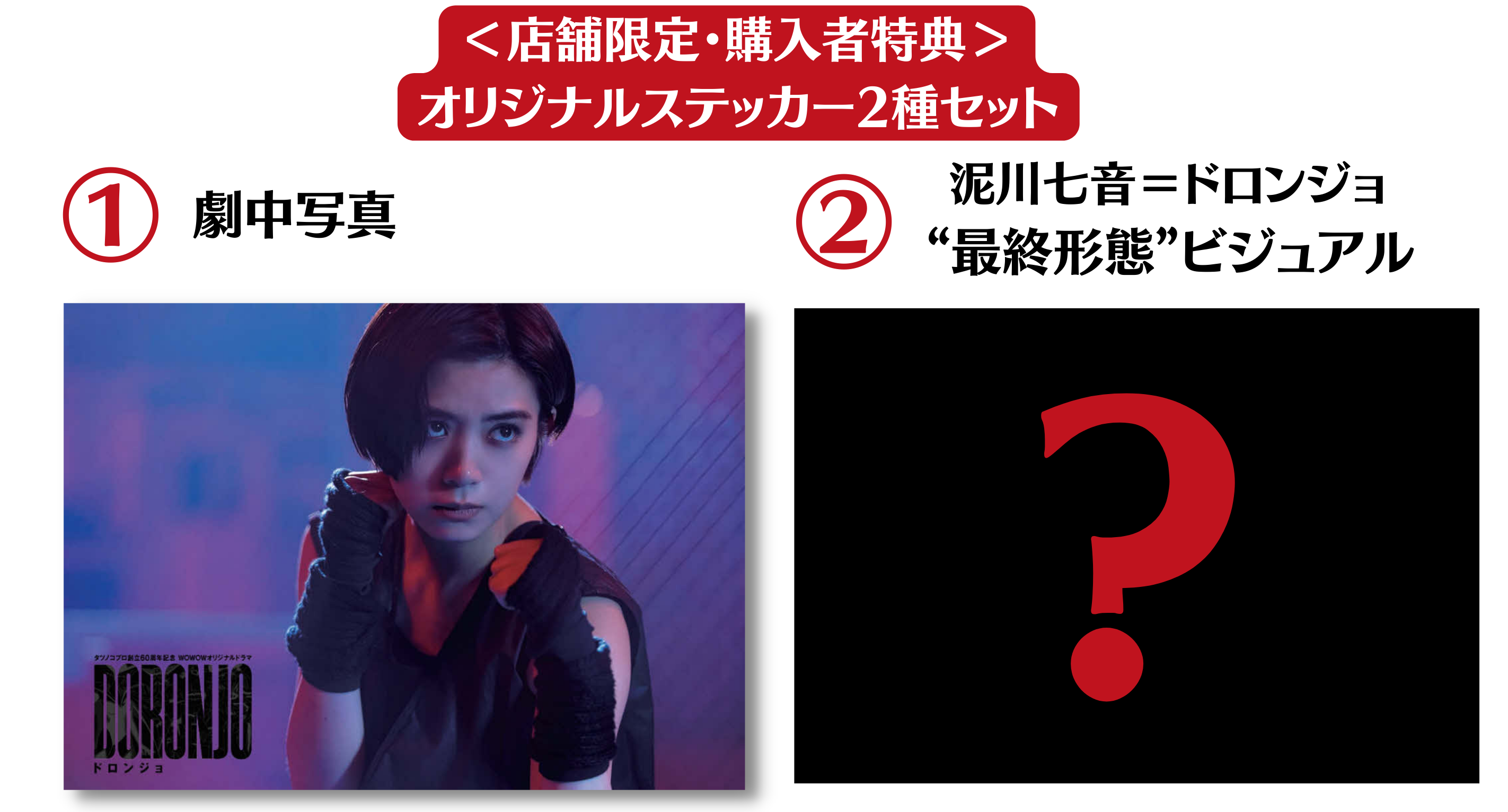 『DORONJO/ドロンジョ 公式ブック』発売を記念して、一部の書店限定で購入者特典「オリジナルステッカー2種セット」(①劇中写真 ②泥川七音=ドロンジョ"最終形態"ビジュアル)をご用意いたしました。