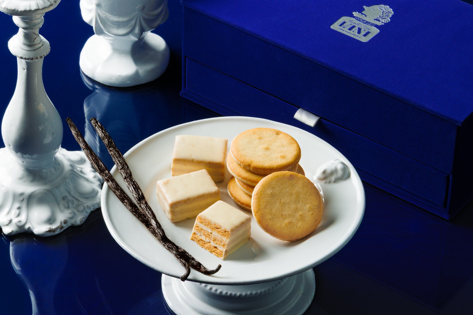 VANIの定番人気商品である「サンドクッキー」と「ミルフィユ」を、洗練された上質な二段仕立てのボックスに一つひとつ丁寧に詰め合わせました。ふたを開けるたびに広がる華やかさに高揚感に包まれる、特別な時間を過ごすにふさわしい、まさに“ロイヤル”なギフトです。