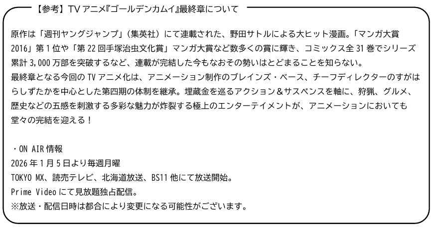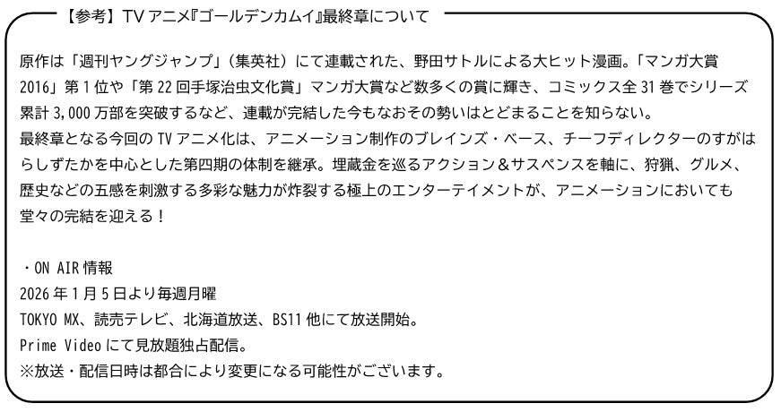 東京地下鉄株式会社(本社:東京都台東区、代表取締役社長:小坂 彰洋、以下「東京メトロ」)は、「ゴールデンカムイ×東京メトロ デジタルスタンプラリー」を2026年1月9日(金)から2026年2月8日(日)まで実施します。
