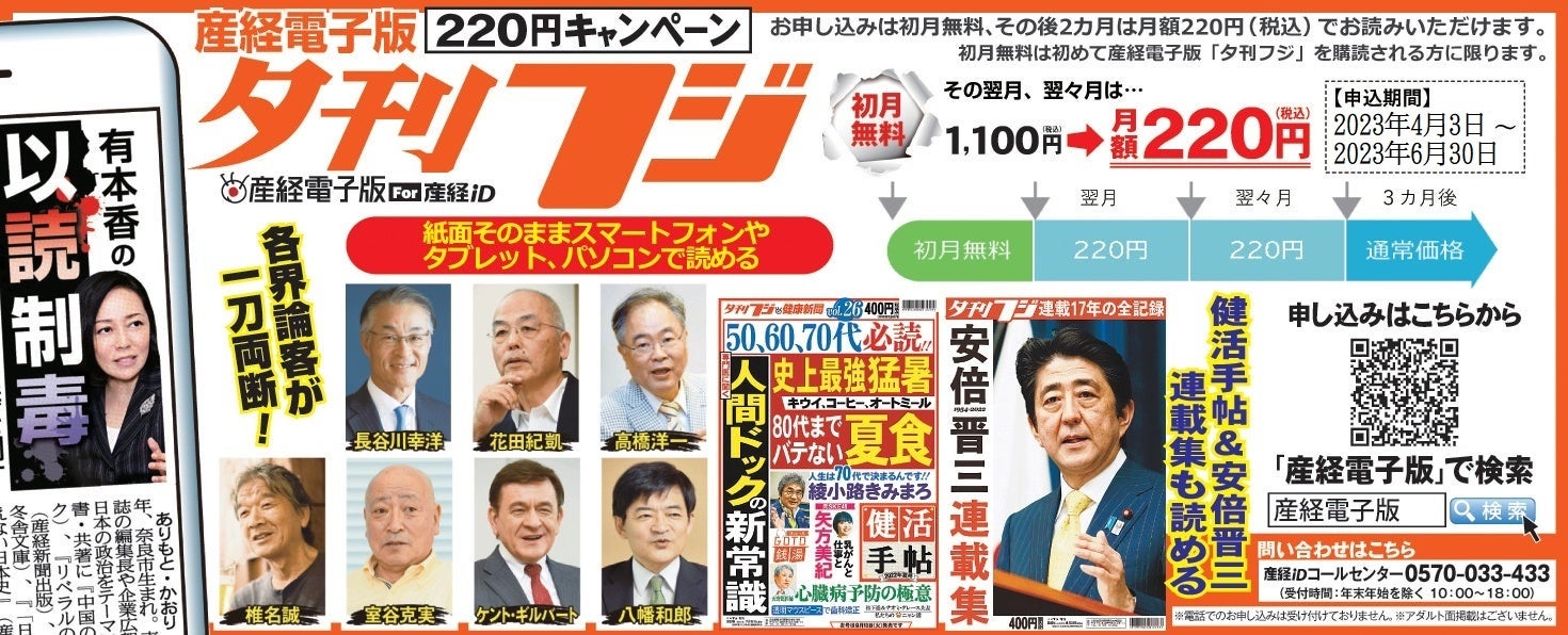 夕刊フジ(産経新聞社発行)は、 産経電子版「夕刊フジ」の月額購読料1,100円(税込)が初月無料、 翌月と翌々月は220円(税込)になるお得なキャンペーンを4月3日から実施します。 受付締切は2023年6月30日まで。 夕刊フジ通常版に加えて、 「安倍晋三元首相 連載集」や「健活手帖」なども追加料金なしでお読みいただけます。