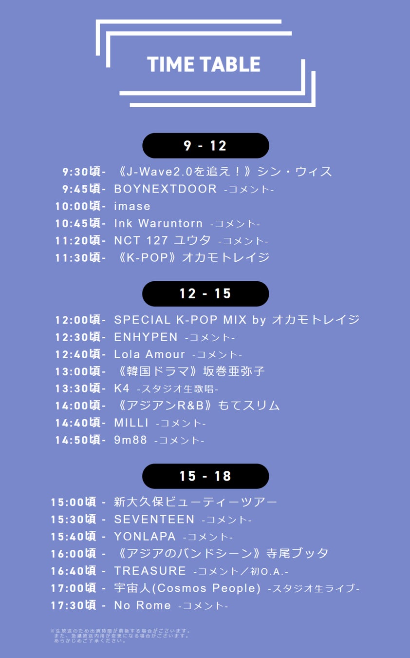 ラジオ局J-WAVE(81.3FM)では、9月18日(月・祝)9:00~17:55、今ますます勢いに乗るアジアの音楽と韓国カルチャーの波を感じる9時間の特別番組『J-WAVE HOLIDAY SPECIAL SPLASH ASIAN-WAVE』を放送いたします。すでに発表されているコンテンツに加え、NCT 127からユウタがコメントで登場するほか、TREASUREの楽曲「BONA BONA」の日本語バージョンを初解禁することをお知らせいたします。