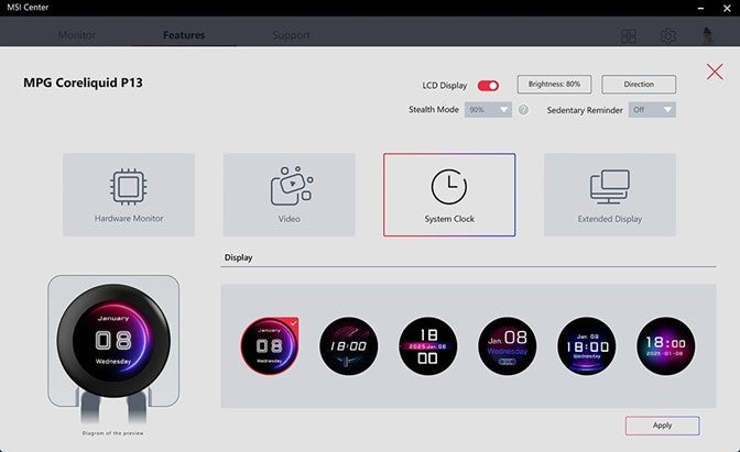 システムに負荷がかかっていない時に、静止した温度表示をずっと見ているのは少し味気ないものです。そんな時は、MSI CenterでP13のディスプレイをエレガントな時計表示に設定しましょう。