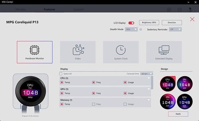ハイエンドなGPUとモニターに投資したのは、美しいゲームの世界を余すところなく体験するためであって、視界の隅でうごめく数字の羅列を眺めるためではないはずです。MPG CORELIQUID P13の2.1インチLCDを使えば、激しいボス戦の間もゲーム画面をスッキリ保ったまま、パフォーマンスや温度を監視できます。