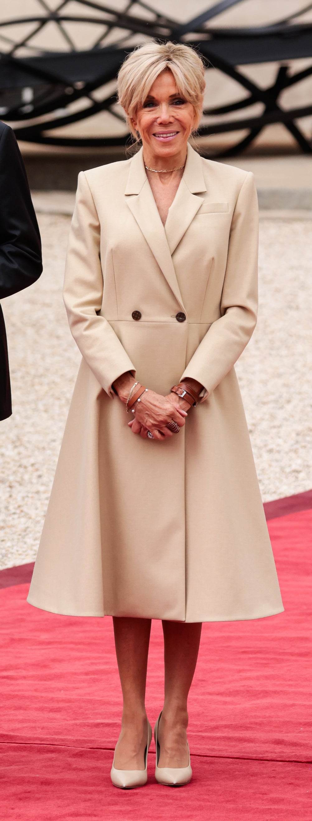 また、ブリジット·マクロン仏大統領夫人は、オリンピック開会式前のエリゼ宮のレセプションにて、ルイ·ヴィトンのカスタムメイドのベージュのカシミアフランネルダブルブレストコートドレスを着用しました。