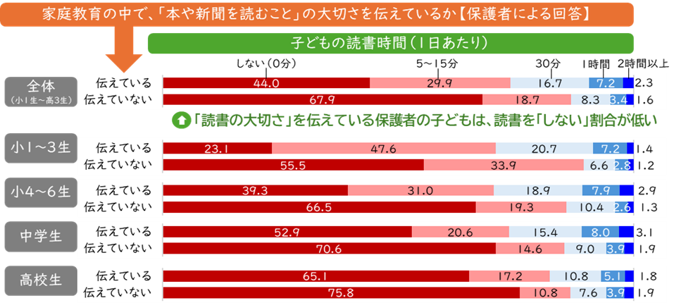 読書を「しない」(0分)比率は、家庭教育の中で「本や新聞を読むこと」の大切さを「伝えている」と答えた保護者の子どもは44.0%だったのに対して、「伝えていない」と答えた保護者の子どもは67.9%だった。保護者が読書の重要性を伝えることには、子どもの読書を促進する効果があると考えられる。