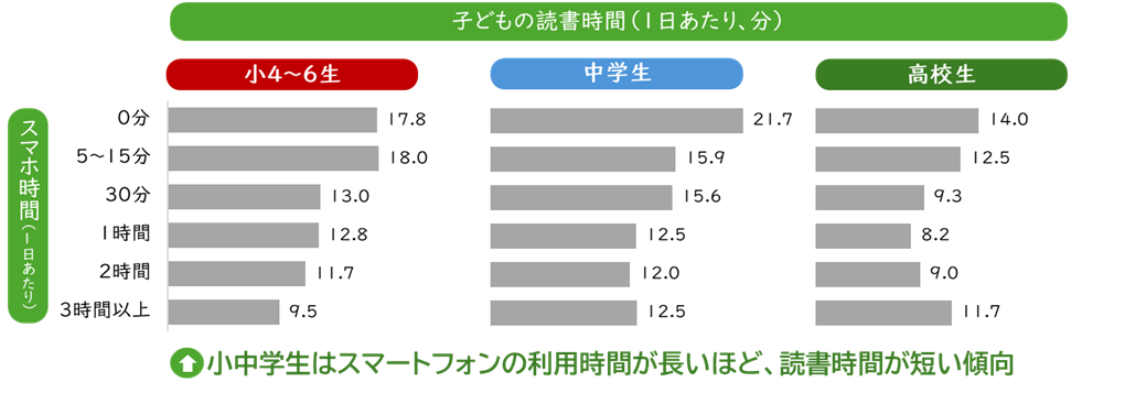 *「あなたはふだん(学校がある日)、次のことを、1日にどれくらいの時間やっていますか」という設問の「携帯電話やスマートフォンを使う」と「本を読む(電子版を含む)」に対する回答を使用。いずれも子どもの回答。