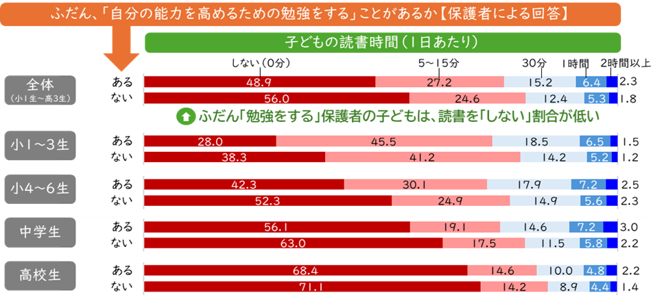 読書を「しない」(0分)比率は、「自分の能力を高めるための勉強をすること」が「ある」と答えた保護者の子どもは48.9%だったのに対して、「ない」と答えた保護者の子どもは56.0%だった。保護者のふだんの学びに対する姿勢と関連がみられる。