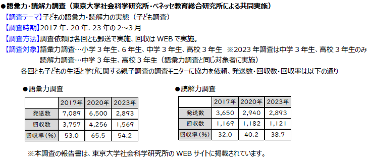 株式会社ベネッセコーポレーション(本社:岡山県岡山市、代表取締役会長兼社長:岩瀬 大輔)の社内シンクタンクであるベネッセ教育総合研究所では、子ども・保護者・教員を対象とした調査を通じて、子育てや教育の実態を研究しています。今回は、10月27日から始まる読書週間に向けて、東京大学社会科学研究所と共同で実施している「子どもの生活と学びに関する親子調査」を中心とした調査結果から、子どもたちの読書行動の実態やスマートフォン(以降、「スマホ」)の利用との関係、語彙力・読解力との関係に関連するデータをまとめました。