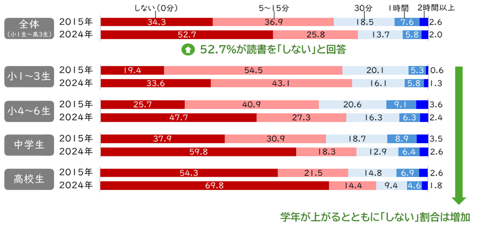 1日の中で読書を「しない」(0分)という回答は52.7%(2024年)と半数を超えた。10年前(2015年、34.3%)と比べて読書を「しない」層が1.5倍に増加している。