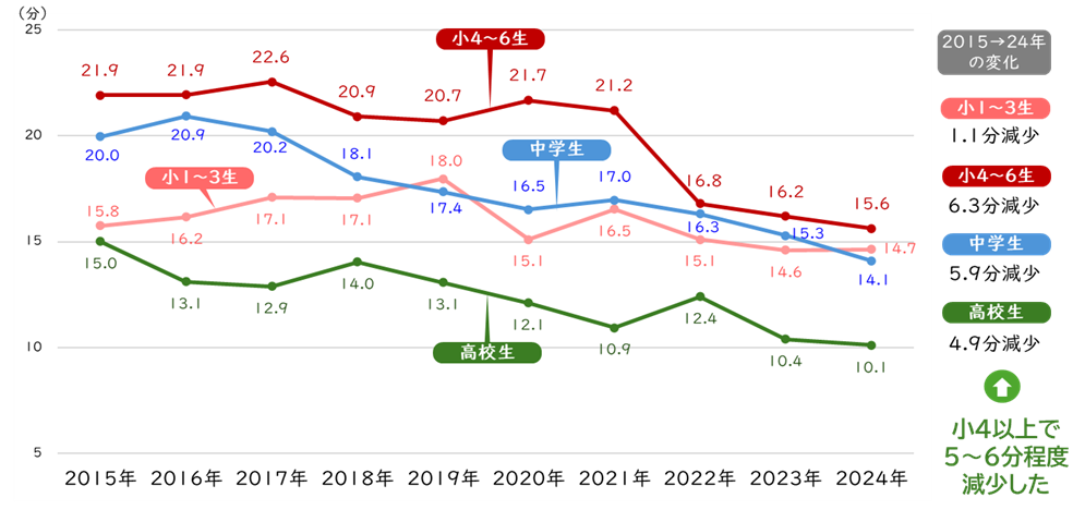 いずれの学校段階でも読書時間は減少傾向にある。とくに、小4生以上で減り幅が大きく、1日あたりの読書時間は2015年から24年にかけて、小4~6生は6.3分、中学生は5.9分、高校生は4.9分減少した。