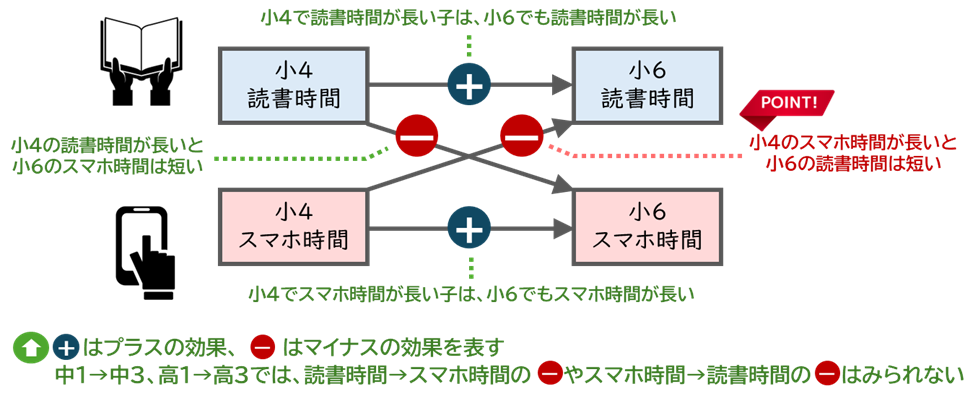 2022年に小4だった子どもを小6まで追跡してスマホ時間が読書時間に与える影響をみたところ、小4のスマホ時間が長いと小6の読書時間が短くなることがわかった。同様の結果は、中1から中3の追跡、高1から高3の追跡では確認できなかった。スマホ時間が読書時間に与える影響は、学年が低いほど大きいことが示唆される。