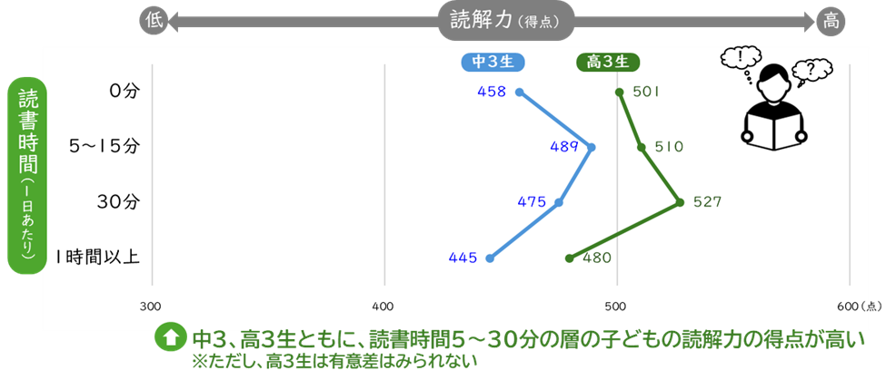 中3生、高3生ともに、読書時間「5~15分」「30分」の層の子どもの読解力の得点が高く、「0分」や「1時間以上」の層では得点が低い結果となった。一定の時間の読書は、読解力を高める可能性がある。