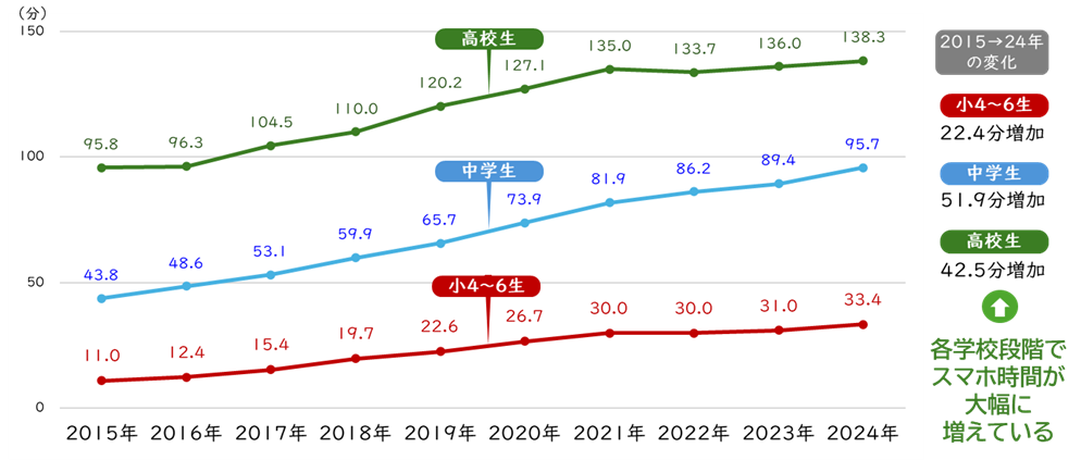 いずれの学校段階でもスマホ時間は増加している。2015年から24年にかけて、小4~6生では22.4分、中学生では51.9分、高校生では42.5分、1日あたりのスマホ使用時間が増加した。