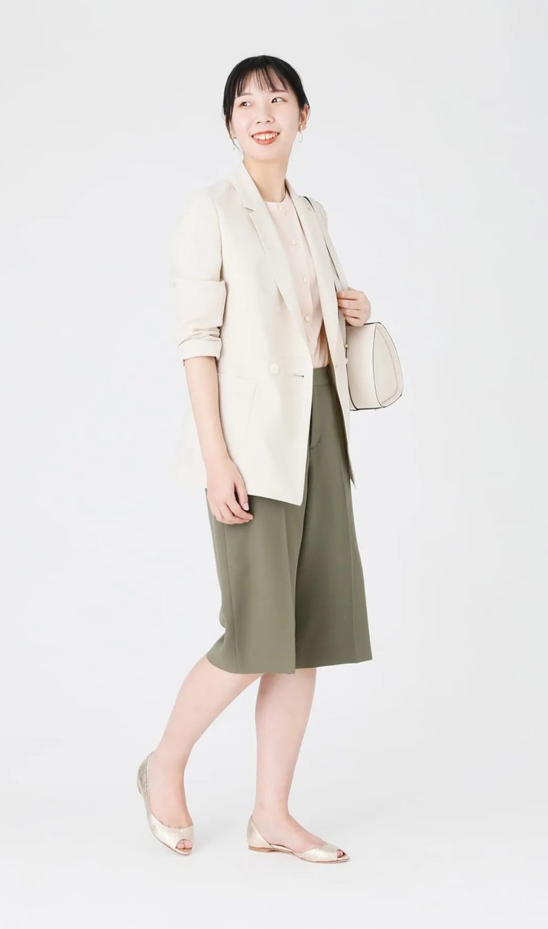 ピンクの甘さが苦手な方にもおすすめの、ベージュやカーキグリーンを取り入れたきれいめスタイル。ベーシックカラーでまとめた穏やかなコントラストなら、落ち着きがありながらも地味な印象を回避。トレンドのハーフパンツは、暗く見えがちな濃色の分量を抑えて軽やかな着こなしを演出してくれます。