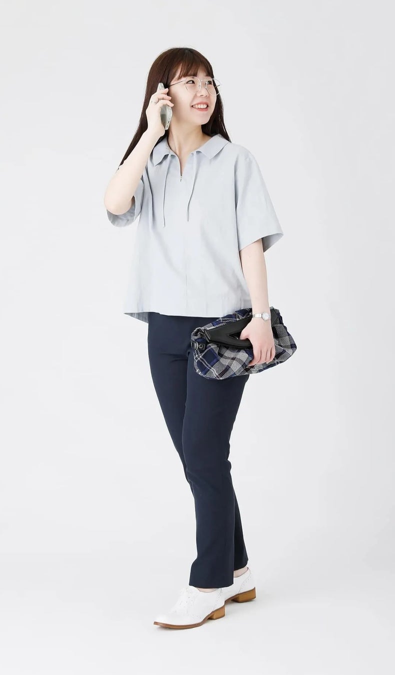 色やシルエットにメリハリを付ければ、淡色アイテムもスタイリッシュな印象に。サックスブルーの爽やかさを引き立てるブラックのパンツは、細身のテーパードシルエットで引き締め効果も◎。顔周りが寂しく感じたり、ぼやけて見えてしまう時は、アクセサリー感覚でメガネを取り入れてみるのもおすすめです。