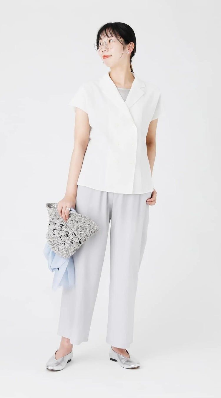 あいまいさんは素材にこだわった、ワントーンコーデがおすすめ!ベーシックなオフホワイトのトップスに、シルバーのサテンブラウスをイン。サテンの艶やかな生地感は、アクセサリーのようにコーディネートを華やかにしてくれます。小物もシルバーやグレーでまとめて、淡く柔らかな印象に。日よけや冷房対策として活躍するストールはブルーをチョイスすると、さりげないアクセントになりますよ。
