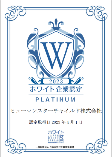 保育事業を展開するヒューマンスターチャイルド株式会社(本社:横浜市、代表取締役:川下 裕左、以下「当社」)はこのほど、ホワイト企業認定制度を展開する一般財団法人日本次世代企業普及機構(本部:大阪市北区、代表理事:岩元 翔、以下「ホワイト財団」)より、4年連続の「ホワイト企業」として認定されました。また、3年連続最上位ランクであるプラチナランクに認定されました。